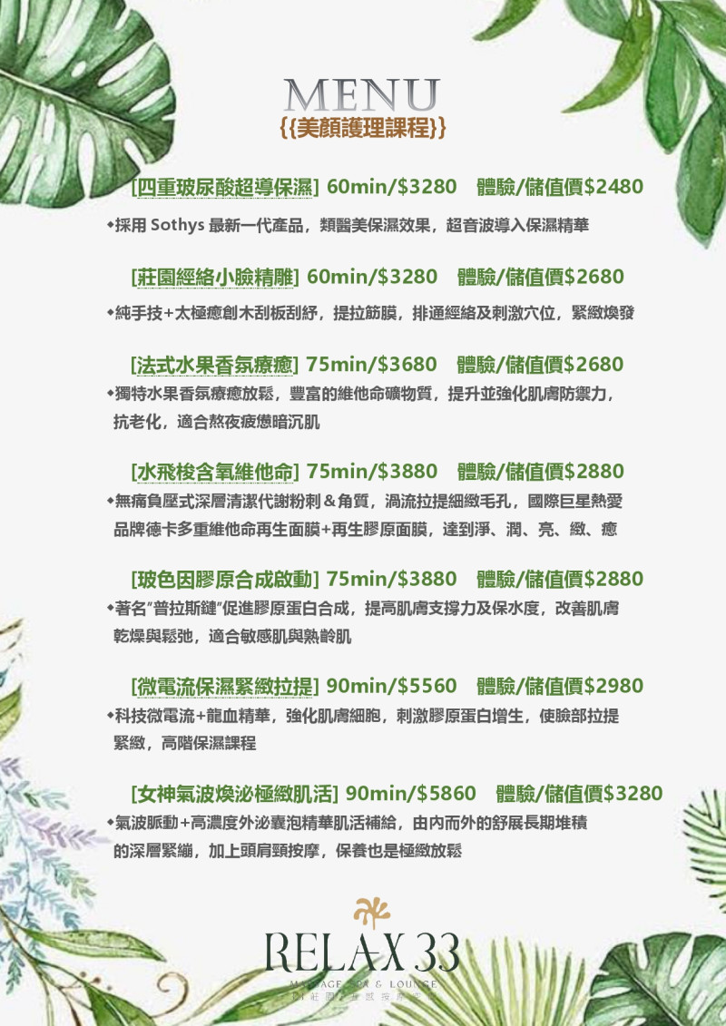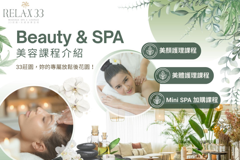 美顏不只是外在保養,更是一段讓身心慢慢回到平衡的時光。Relax 33 美顏護理課程結合專業保養品牌、細緻手技與溫和流程,從清潔、代謝到補水舒緩,層層照顧肌膚需求。無論換季乾燥、環境刺激或日常疲憊,33 莊園都為妳準備好一段安心放鬆的美顏旅程,讓肌膚在細心呵護中,回到柔軟、透亮與舒適的狀態。