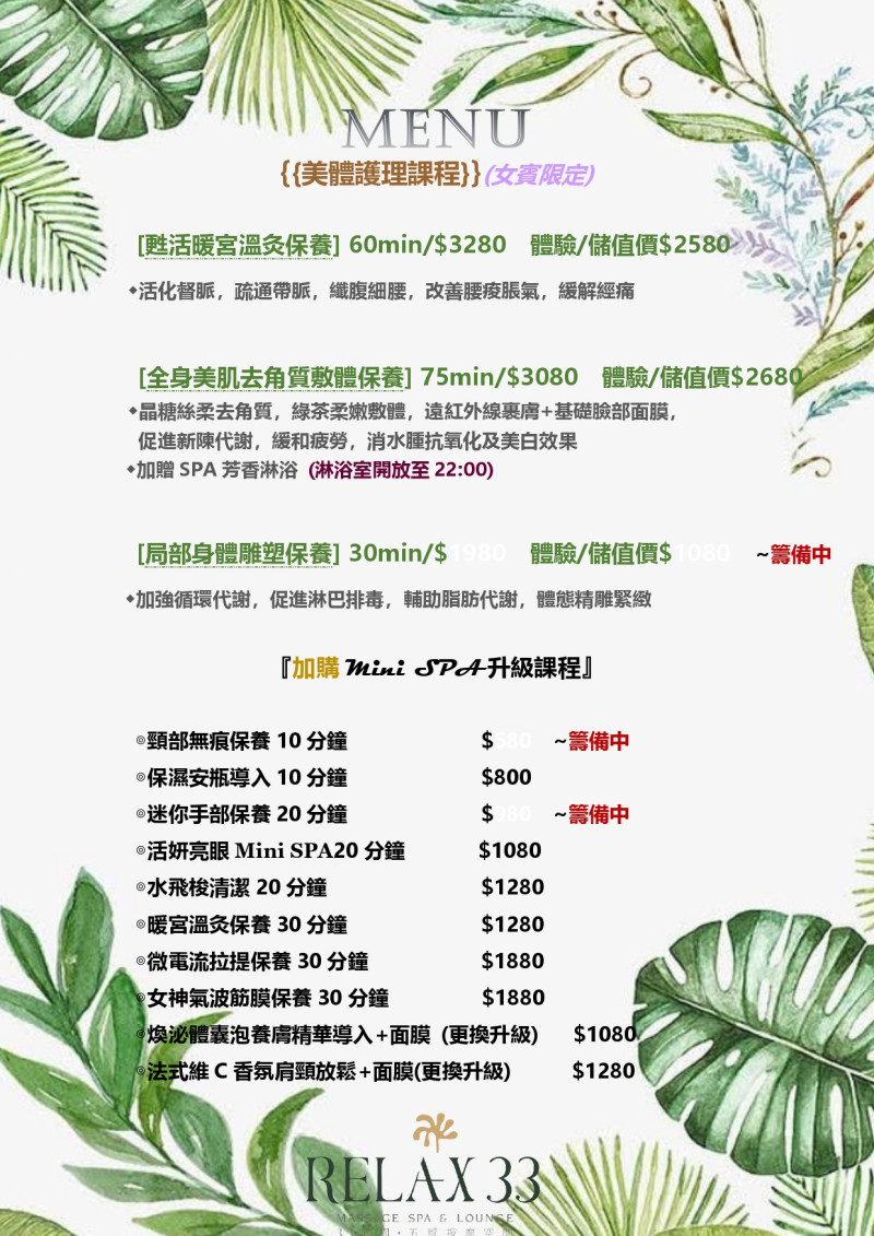 Relax 33 為女性量身設計多款美體與 Mini SPA 課程,結合溫熱保養、代謝調理與細緻手技,協助身體舒展緊繃、釋放壓力。無論是想深層暖宮、全身去角質,或以 Mini SPA 彈性加強局部呵護,都能依照當下需求自由選擇,讓每一次保養都貼近妳的身體狀態,輕鬆享受被溫柔照顧的片刻。